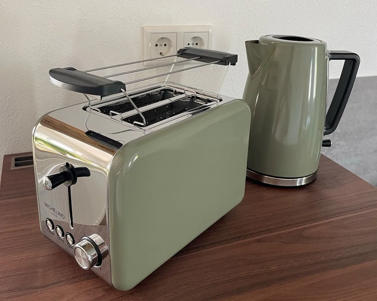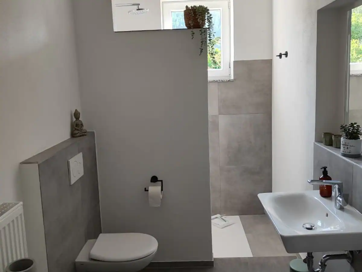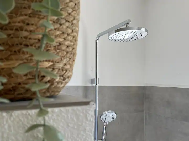 ausgestattet mit Gäste-, Hand- und Duschtüchern, Fön, XL-Rainshower-Dusche, Toilettenpapier, Duschgel, Haarshampoo, Handseife.