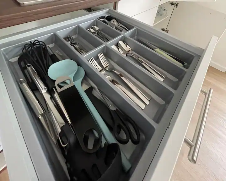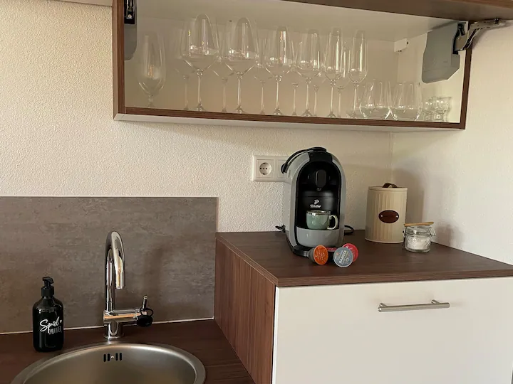 Küche: Voll ausgestattete Küchenzeile mit Geschirrspüler, Herd und Kühlschrank. Eine Kaffeekapselmaschine mit einem Starter-Set Kapseln für entspanntes Ankommen. Des Weiteren gibt es Geschirrspültabs, Küchenrolle, Teeauswahl, Spülmittel, Geschirrhandtücher/Reinigungstuch, Zucker, Salz,-/Pfeffermühle.